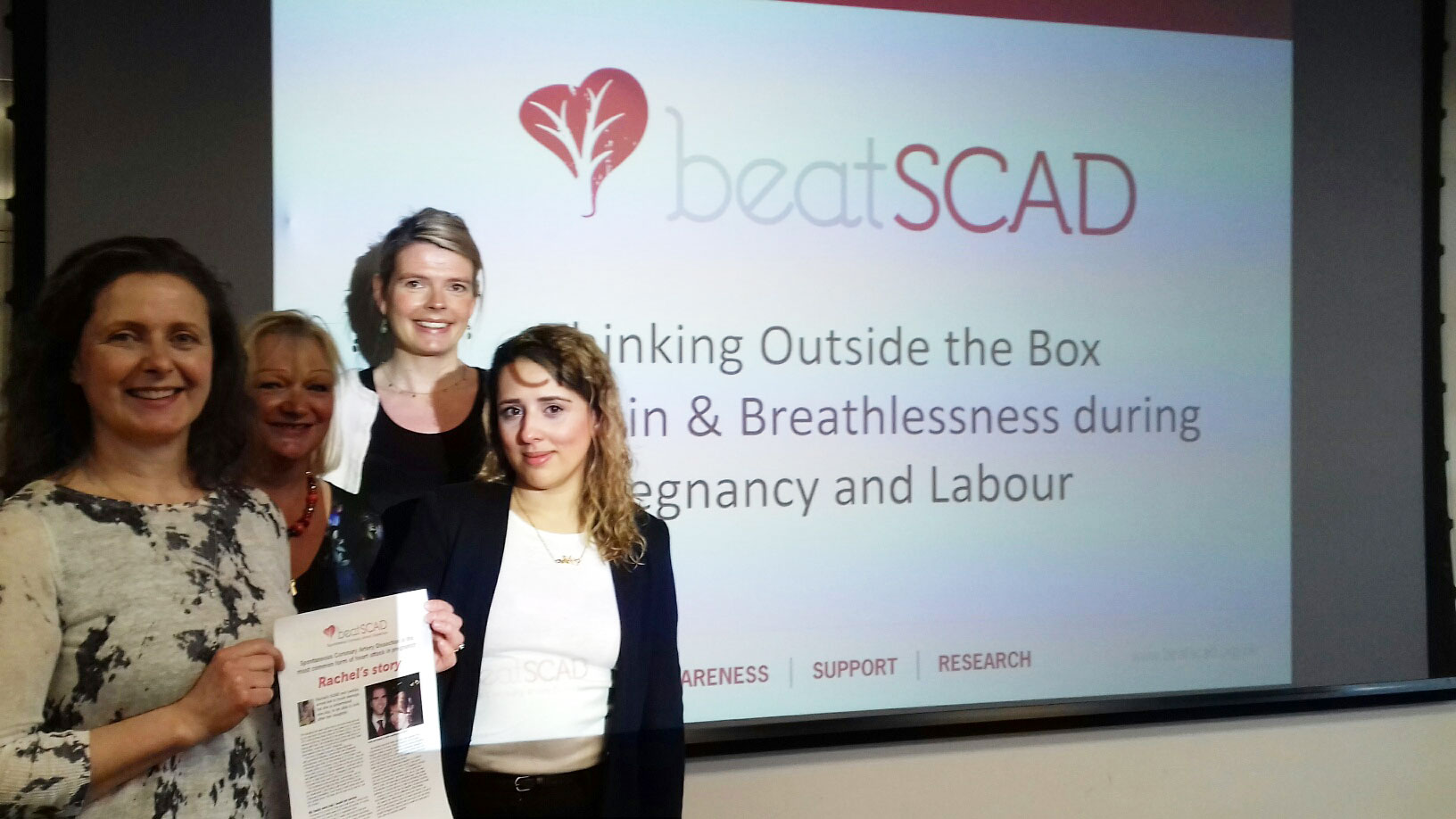 Sarah told her SCAD story and talked about how SCAD patients don’t conform to the stereotypical view of heart attack patients. She urged the audience to consider SCAD if their pregnant ladies display cardiac symptoms and to ensure the necessary diagnostic blood tests are carried out as soon as possible. Many SCAD survivors have not been diagnosed quickly, often being told they are ‘anxious’, and as a result have suffered major heart damage. Sarah also explained the work Beat SCAD does to increase awareness of the condition, support survivors and raise money to fund research.