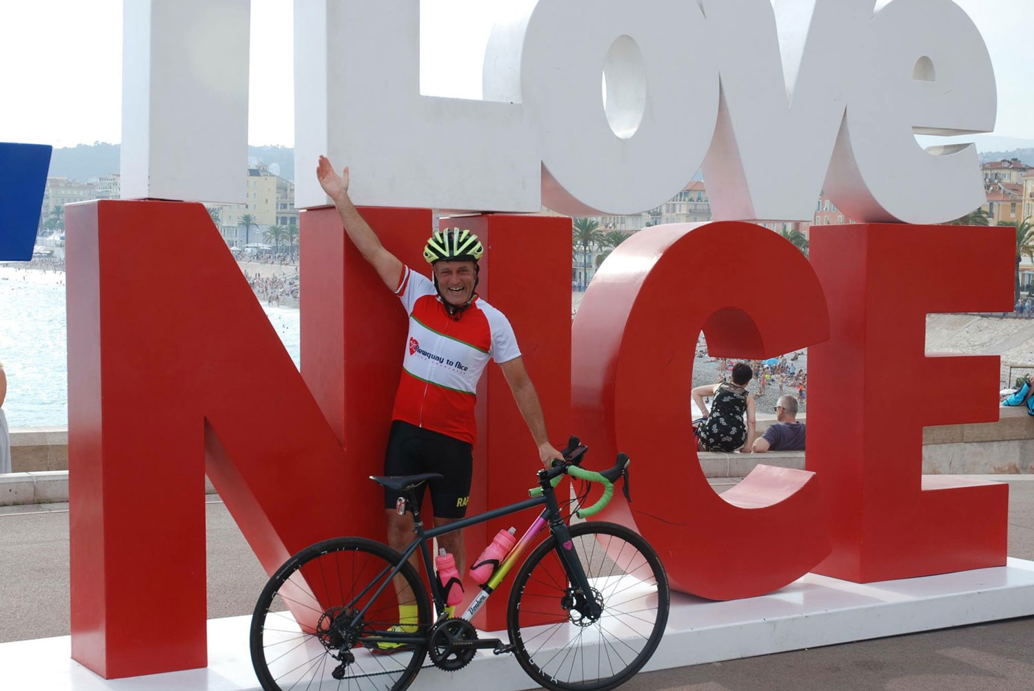 David completed his cycle in the beautiful city of Nice on 24 July – saddle sore, aching but celebrating his fantastic achievement.