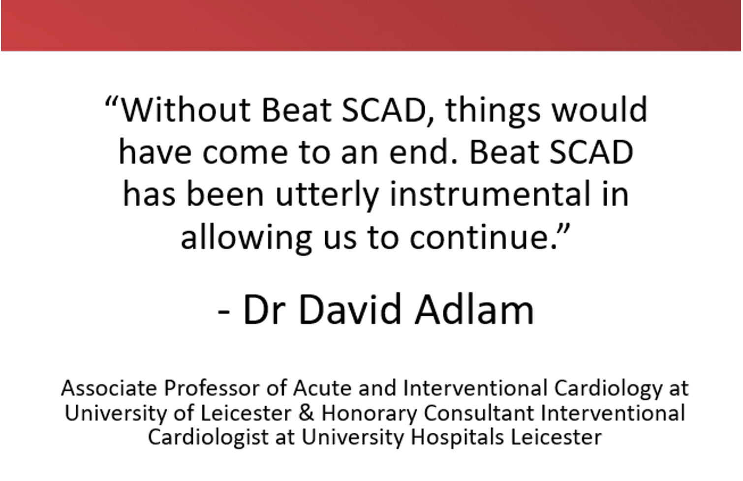 Beat SCAD will continue to apply and develop our compassion, resilience, determination and passion to provide hope to patients, empower the community, build relationships and advance our mission to achieve a world that understands SCAD, where those affected are quickly and accurately diagnosed and never feel alone.
